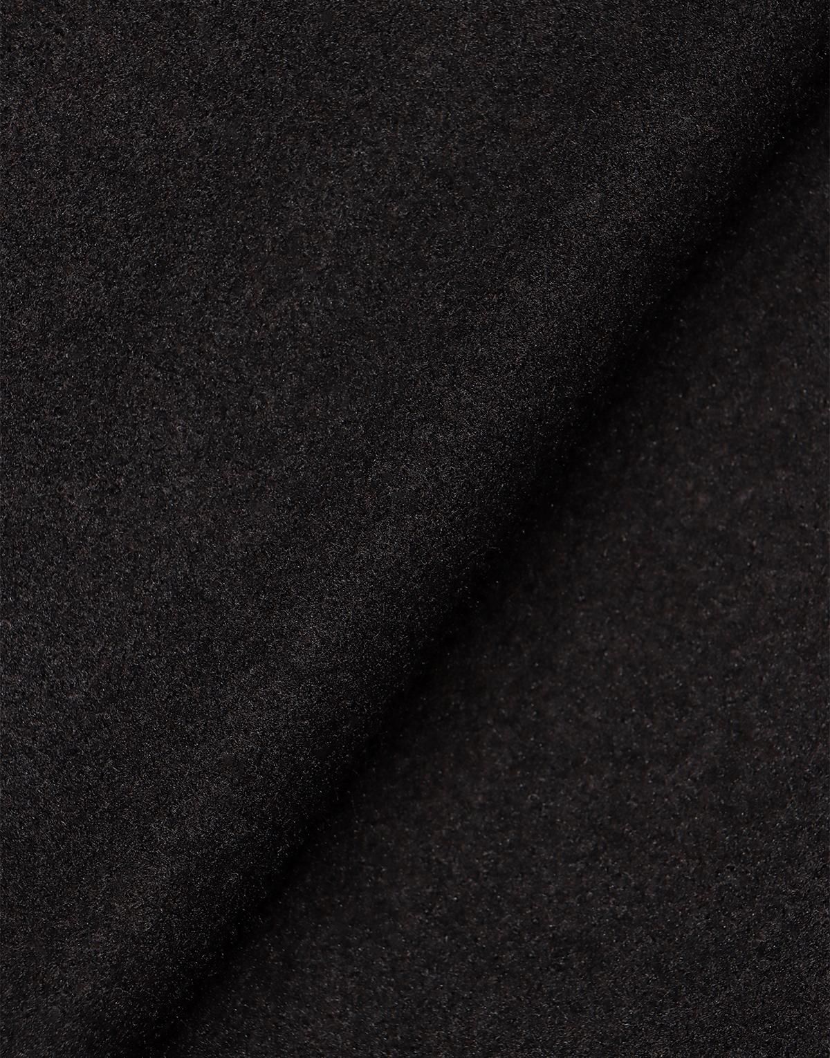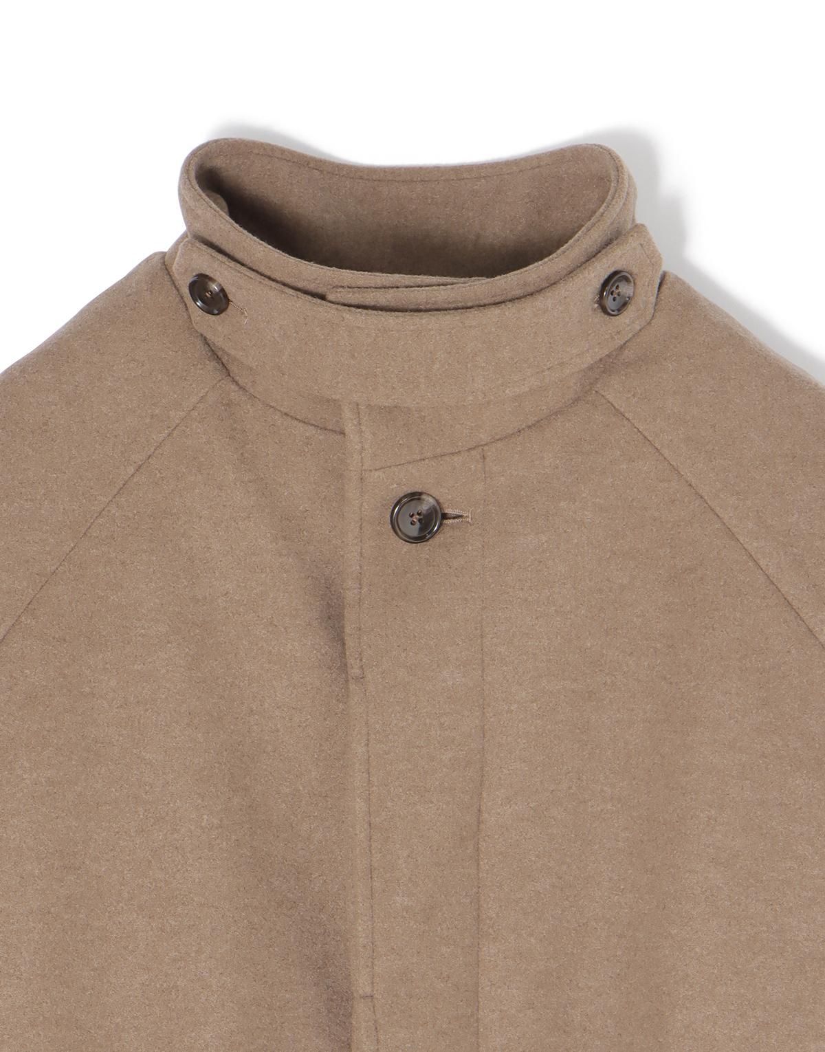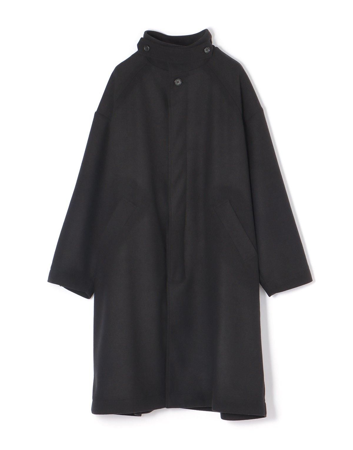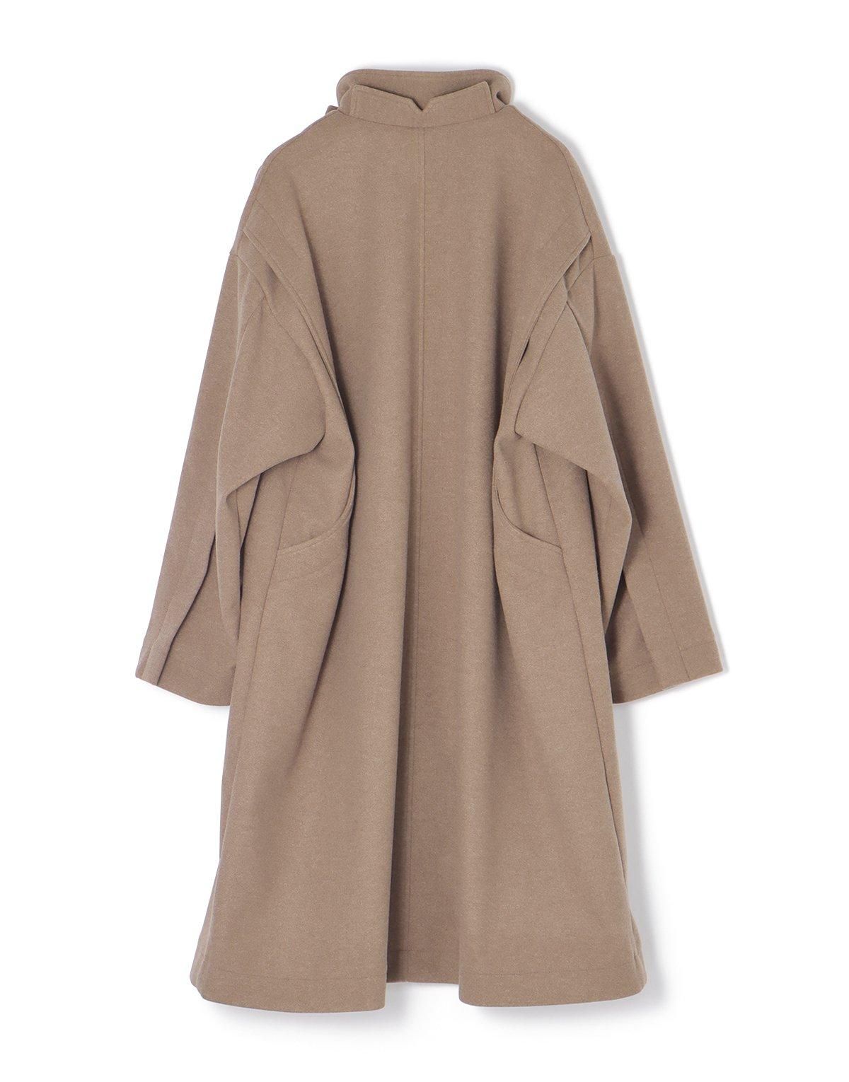UNISEXCOAT 比翼仕立て衿のチンフラップでスッキリとした印象だが、後ろ衿後ろ身頃のアクションプリーツと大胆なデザインも特徴的。